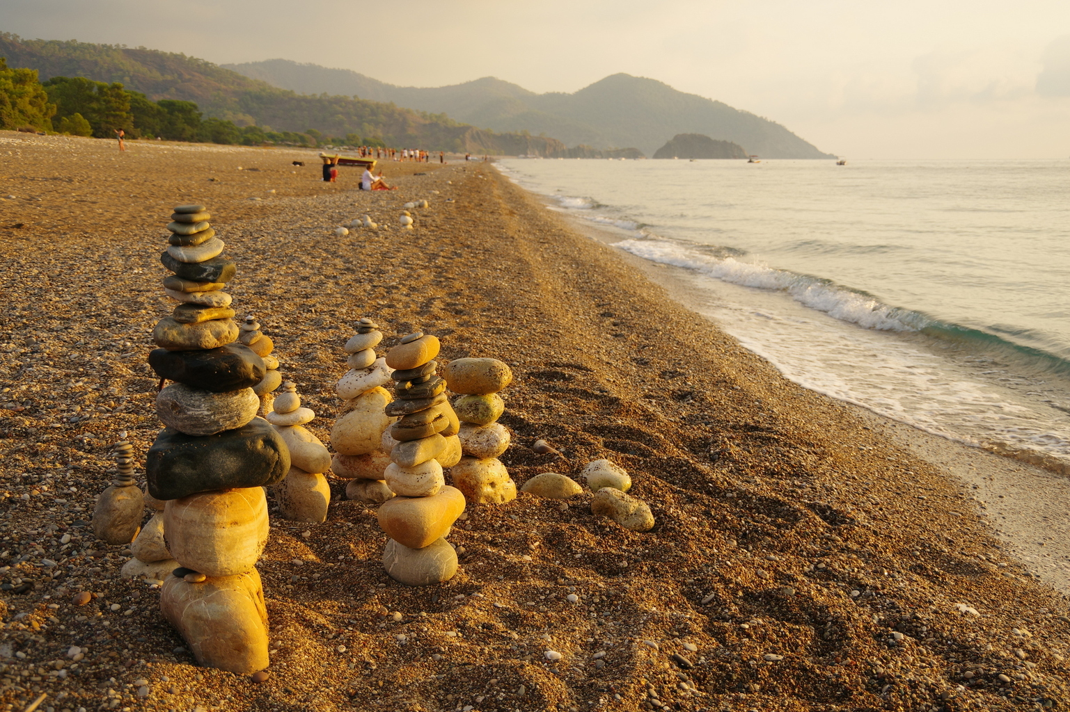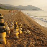 - Steintürmchen am Strand – Entspannung im Abendlicht
