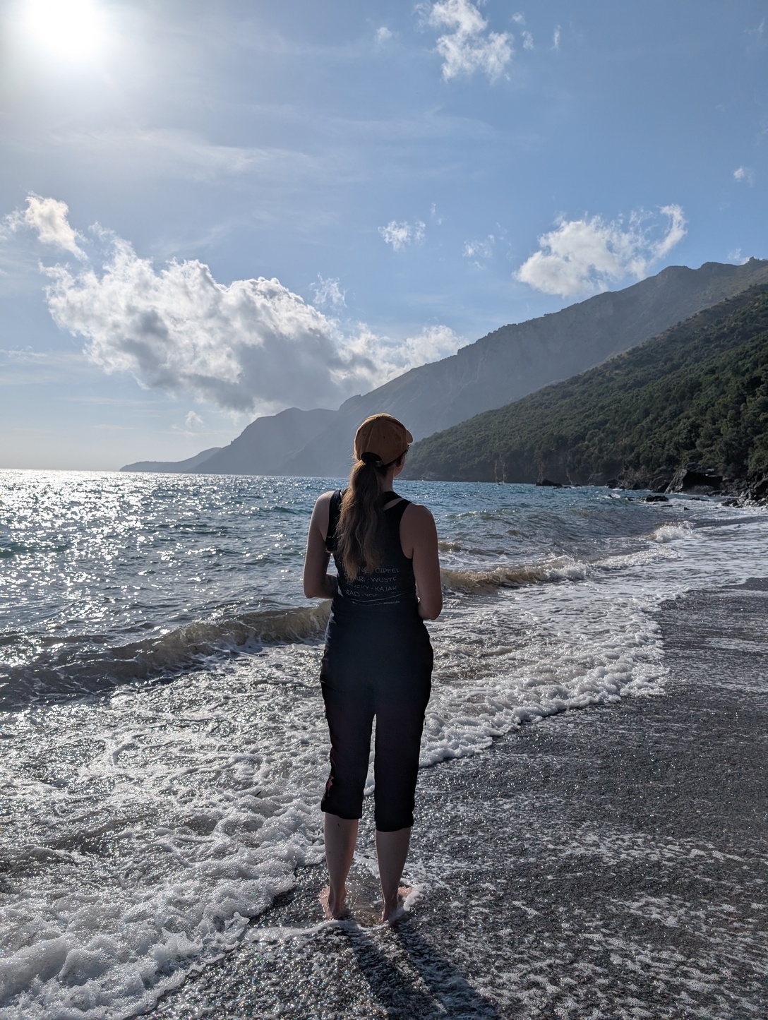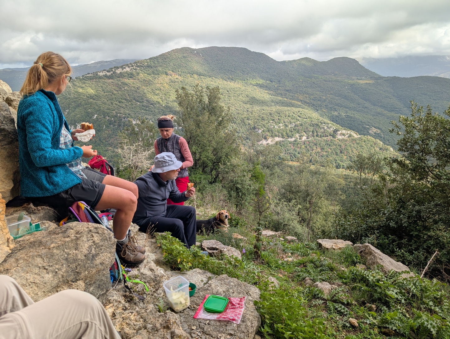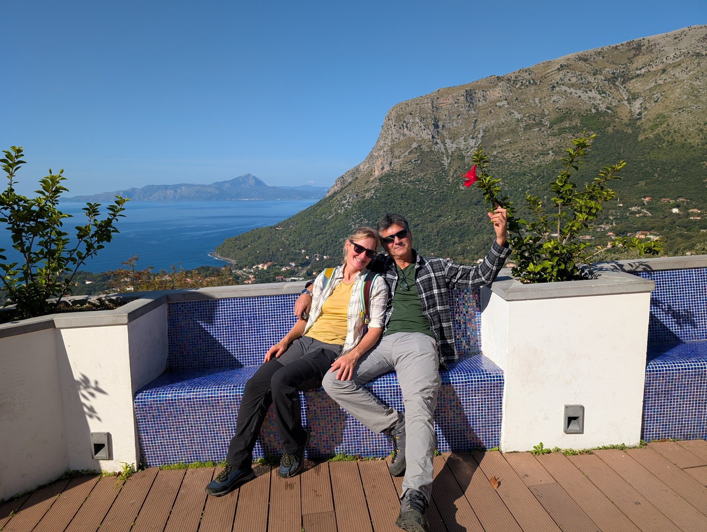 Mit Tagesrucksack, Badesachen, Regenjacke (sicher ist sicher) und versorgt mit den frisch zubereiteten Lunchpaket-Zutaten der Hausfee Graziella, schlüpften wir nach dem ausgiebigen Frühstück in unsere Wanderschuhe. Unterwegs noch flink die Trinkflaschen mit kühlem Quellwasser gefüllt – und dann ging’s auf in die Berge oder an die Küste. Einmal am Wander-Startpunkt angekommen, führten uns Miriam und Roberto an sechs Tagen über zum Teil fast zugewachsene Wege, vorbei an Oliven- und Erdbeerbäumen (Corbezzolo), blühendem Safran-Krokus und bis ans Meer abfallenden Berghängen durch ihre Heimat: den bergigen, aber zu unserem Glück noch recht wenig begangenen Cilento-Nationalpark. Während der Wanderungen begegneten uns kaum Menschen und wenn, dann waren es italienische Pilger, die den durch unser Reiseleiterpaar belebten San-Nilo-Fernwanderweg gingen.