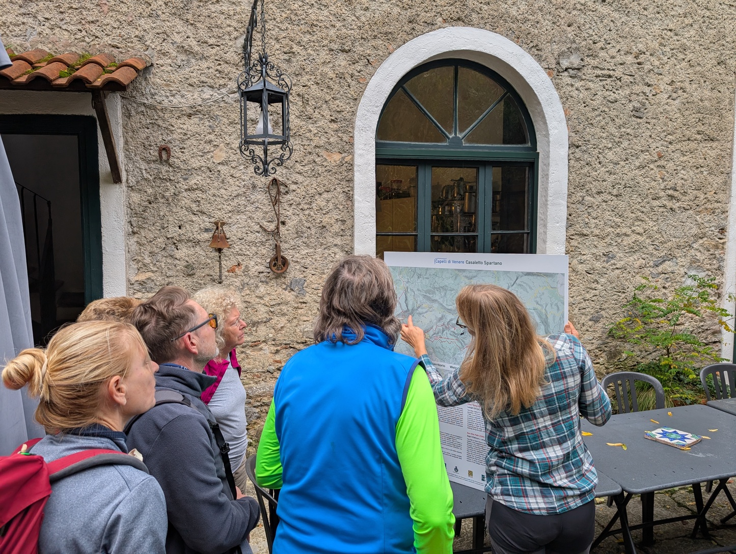 Wenn die Zeit gekommen ist, in der die essbaren Castagne vom Baum plumpsen und aus ihren stacheligen Schalen lugen, ist das für die Dorfgemeinschaft Casalettos ein Grund zum Feiern. Und so wurden auch wir für unseren letzten Abend noch einmal Teil der Dorfgemeinschaft beim Castagnata-Dorffest: auf der von Tanz und angeregtem Geplauder belebten Dorf-Piazza probierten wir aus dem großen Topf die delikate Kastanien-Pasta, bevor wir am nächsten Tag unsere Heimreisen antraten.